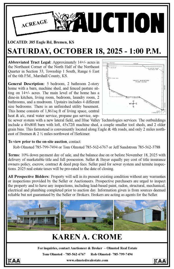 Contact Rob olmsted 785-799-7494 or Tom Olmsted 785-562-6767